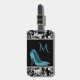 Chic lady's luggage tag done in a black background, with graphics of a silver damask top and bottom edge and a single aqua foil looking high heel. Personalise the one letter monogram and text field to suit your needs. A stand out luggage tag that is hard to miss.