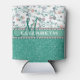 A aqua / turquoise / teal glitter that sparkles on the bottom, and a pattern with twirl / swirl flower design background pattern on the top with green / aqua vines and pink / purple flowers. The centre is left for personalisation / personalise surrounded with white diamond rhinestones. (PHOTO PRINT)