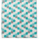 Honeycomb pattern shower curtain in shades of aqua, turquoise, white, and grey.
