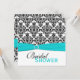 This black and white damask bridal shower invitation with an aqua blue FAUX ribbon and jewelled brooch matches the wedding invitations shown below. All the text is customisable and so is the paper choice. If there are any other items you need to make your event extra special, please email your request to niteowlstudio@gmail.com. If you want this invitation in another colour combination, email the request to the above address.