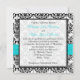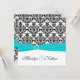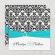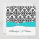 This black and white damask wedding invitation has an aqua blue PRINTED ribbon and PRINTED diamond jewel buckle on it that would be perfect for an aqua and black themed wedding. **Some of the papers will alter the colour of the design, so use caution if you choose the felt paper, as it may yellow the look more than you want. I would NOT use the champagne, gold or silver metallic papers, as they will darken the design without adding any extra sparkle to it than what you would get with the metallic ice paper. ALSO, if you re-size the invitation, or if you change fonts, or the size of the font, some of the design and/or text may get cut-off. Everything will print as you see it on your monitor. I will not see your invitation, and Zazzle will NOT correct anything (typos, mis-alignment etc.). The text and paper is all customisable. ****PLEASE NOTE that only the small RSVP card (3.5x5) shown below will fit inside the envelope for this square invitation. If you need help with this invitation, please email me BEFORE you place your order. If you require any other matching items, please email your request to niteowlstudio@gmail.com.