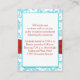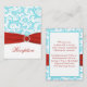 This aqua blue and white floral damask Reception Enclosure card has a red PRINTED ribbon and a PRINTED jewel buckle on it that matches the wedding invitation shown below. Some of the papers will alter the colour of the design, so use caution if you choose one of the paper types besides the basic white shown here. ALSO, if you re-size the card, or if you change fonts, or the size of the font, some of the design and/or text may get cut-off. Everything will print as you see it on your monitor. I will not see your card, and Zazzle will NOT correct anything (typos, mis-alignment etc.). The text and paper is all customisable. If you need help with this card, please email me BEFORE you place your order. If you require any other matching items, please email your request to niteowlstudio@gmail.com