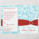 This 8.5"x11" aqua blue and white damask wedding program has a bright red PRINTED ribbon with a PRINTED crystal jewelled brooch on it. It matches the wedding invitation and other items shown below and is fully customisable. It is designed to be folded down the centre. ****PLEASE NOTE that the higher grade paper is a card stock and does not fold well. All the text is customisable. Existing matching items in this design are shown below. Email niteowlstudio@gmail.com if you need any assistance with the customisation of this, or if you have any questions or requests.