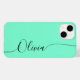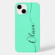 Aquamarine Elegant Black Calligraphy Script Custom Personalised Name iPhone 14 Smart Phone Cases features a modern and trendy simple and stylish design with your personalised name in elegant hand written calligraphy script typography on an aquamarine background. Designed by ©Evco Studio www.zazzle.com/store/evcostudio