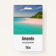 Name tag with a beautiful photograph. A scenic tropical beach with aquamarine water and a white sandy beach with a lush forest in the back.