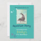 A birthday part invitation with an aquarium theme. Decorated with a A friendly playful dolphin swimming towards you in cool green tropical water with bubbles and splashes all around, as well as some cute starfish drawings. Personalise with your party details.