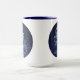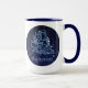 Mug featuring the zodiac symbol for Aquarius in soft silver blue, as a round medallion, overlaid with the stars of the constellation, against a starry sky background graded from deep midnight blue to black.