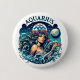 A fun horoscope sign Aquarius button with a pretty celestial illustration of a water bearer woman in front of stars and a full moon.