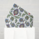 Arabesque ornate floral pattern in shades of olive green, cove blue and warm red. Leaves, stems, blossoms and forget me nots.