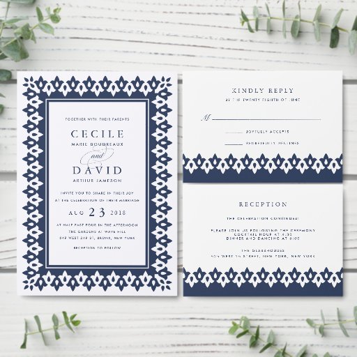 Designed to coordinate with our Arabesque wedding and event invitations, this elegant response card in classic navy blue and soft, ethereal mint green features a Moroccan inspired geometric bottom border. Add your RSVP date and reply text in navy.