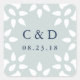 Seal your wedding invitation envelopes, favours and more with our elegant Moroccan inspired stickers in ethereal pastel blue-green and white. Rounded square design features your initials and wedding date in navy, surrounded by a geometric border in white on a pale mint background. Coordinates with our Arabesque wedding invitation collection in Mist.