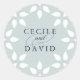 Seal your wedding invitation envelopes, favours and more with our elegant Moroccan inspired stickers in soft mint and navy. Round design features your names connected by decorative script and surrounded by a geometric border in white on an ethereal light blue-green background. Coordinates with our Arabesque wedding invitation collection in Mist.