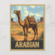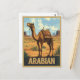 Evocative travel postcard showcasing a camel caravan traversing the vast Arabian desert. Warm tones and majestic mountains create a breathtaking scene. Perfect for home décor or travel enthusiasts.