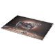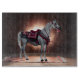 A beautiful Arabian horse wearing traditional desert saddlery on a tempered glass cutting board.