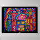 Influenced by Hundertwasser this painting shows a colourful part of my town, Berlin-Neukölln. You can see Arabian style and European style architecture mixed in an imaginative way.Stars are shining from a night blue sky. Four small elephants are walking in front of the houses. On the left side of the painting a rainbow is finding its way like a street. Markers on wood by Carina Rainbow, Berlin 2011.