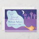 A gorgeous and fun Arabian night magic lamp birthday party invitations. This invitation features an Arabian skyline and a magic lamp in the foreground and a moon and stars in the background. The invitation is purple and blue to make it magical.