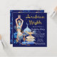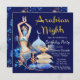 Arabian nights birthday party invitations with beautiful blue and gold illustrations on a royal blue background. This gorgeous Arabian Night birthday party and event invitation is easily customised for your event by simply adding your details. You can also change the background colour. This is a printed design with no real glitter, foil, etc.