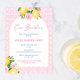 This modern baby shower invite design features a popular arch shape and lemons, with pink floral highlights against a pink and white background print made from a vintage tile.