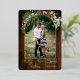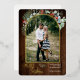 This design features watercolor holly and eucalyptus around an arched picture with a gold foil frame.