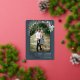 This design features watercolor holly and eucalyptus around an arched picture with a gold foil frame.