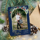This design features watercolor holly and eucalyptus around an arched picture with a gold foil frame.