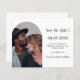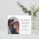 On front: Add your own vertical size photo inside the arch photo frame. A chic white background, black text. Templates for names and the date. The name and the text: Save the Date are written with a modern hand lettered style script with a heart.