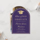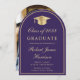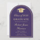 Formal arch-shaped purple college graduation announcement featuring a gold grad cap, the graduate's name and class year in an elegant gold script, their university, major and honours in classic gold serif typography, and their photo on the back of the card.