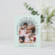 Budget-friendly mint green marriage announcement and reception invitation. The front features your wedding photo in an arch frame, "Happily Ever After Party" in elegant typography and your first names, wedding date and location. On the back, customise your announcement and invitation, add your names in a signature-like script and input your wedding website address to create a scannable QR code for your guests to scan to RSVP online and obtain additional details.