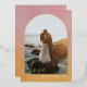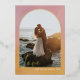 This modern holiday card features a single, vertical photo framed within a beautiful real foil arch. The background has a rich, painted texture in warm pink and gold colours. Personalise this flat card with a custom greeting, script text, name, year and vertical photo on the front. Select real gold foil, silver foil or rose gold foil. Choose between a wide array of paper types. Select the rectangular shaped 5" x 7" card or add a dye cut border shape. Matching items are available. Perfect for a Christmas, holiday or wedding photo card to share with family and friends.