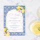 Trendy watercolor lemons and glossy green leaves with a cobalt blue and white vintage tile design this modern baby shower invite design.