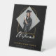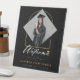 A modern minimalist graduation party celebration welcome photo predestal sign design featuring a minimalist arch tassel frame on a diamond shaped (mortarboard) photo.