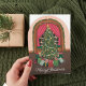 Original illustration of victorian christmas tree decorated with real candles; arched window with snow.