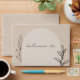 Tan colour scheme with arch and botanical design on front. Address templates on back flap. Front features "deliver to" script