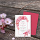 This summer wedding invitation features a bohemian-style arch adorned with red pink and flowers and leaves. The charming design displays a frame with roses, dahlias, and foliage in various shades of pink. The reverse side of the invitation is a vibrant, solid red pink colour.