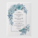 Arch with teal blue flower arrangement and leaves wedding vellum overlay invitations. These wedding invitations present a beautifully designed boho aesthetic, featuring a vellum overlay with an arch illustration. The arch is embellished with a charming flower arrangement of teal and aqua blue dahlias, roses, and leaves, creating a sophisticated and elegant design. The cool blue hues of the floral details lend a touch of refinement, making these invitations the perfect way to invite guests to your summer wedding celebration.