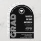 These arched graduation announcements blend retro with modern in black and white for a classic look. A mix of fonts, from the openwork typography GRAD down the side to the bold lettering for the graduate's name, adds to the interest. Each card reverses to white with a thin openwork cap and tassel design. Easy to customise, just add your graduate's details using the text templates and create your own one of a kind graduation announcements.