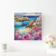 "Arches By The Sea". A idyllic view of a beautiful bay, with a single boat. A small sandy beach is framed by a beautiful azure sea and pink and purple flowers.