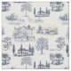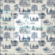 Navy and crème toile pattern of my own design. The individual images are historic American homes drawn in the 18th century, courtesy of New York Public Library public domain collection.