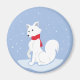 A white arctic fox wearing a red scarf sits in the snow. This design is available on multiple products including t-shirts, postcards, coffee mugs, keychains, and more! It can be customised or personalised by adding your own text or images!