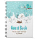 This cute and fun baby shower guest book features an adorable arctic fox family in a winter wonderland setting with snow capped trees and a blue bird on a branch with holly. In the background is a teal blue green sky and falling snowflakes. The text combines decorative and sans serif fonts for a stylish and modern look. This is perfect for a Christmas or winter themed baby shower.