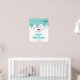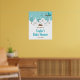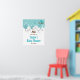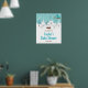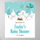 This cute and fun baby shower welcome sign features an adorable arctic fox family in a winter wonderland setting with snow capped trees and a blue bird on a branch with holly. In the background is a teal blue green sky and falling snowflakes. The text combines decorative and sans serif fonts for a stylish and modern look. This is perfect for a Christmas or winter themed baby shower.