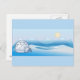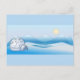 A cool little Arctic scene with an igloo and a pale yellow, sun rising above snowy mountains on a pale blue background.