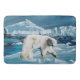 A white polar bear in the snow of the arctic of winter with an iceberg in behind