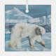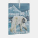 A white polar bear in the snow of the arctic winter with an iceberg in behind them.
