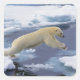 Arctic, Svalbard, Polar Bear extending and rising while leaping from one ice floe to another with blue water background � Stoney and Jan Edwards / DanitaDelimont.com