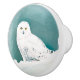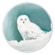 A snowy owl in the arctic snow of winter with a teal blue sky