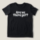 Funny young traveller's t-shirt has a message that says 'Are we there yet?" set on a medium blue background.
