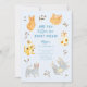 Fun cat themed birthday party invitation featuring illustration of cute cats with party hats and blue flowers. The text says "are you kitten me right meow."