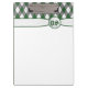 Argyll green plaid with a bow and a golf ball image as part of the knot, the ball has room for your initials or club name for example, the image and text can be changed to your own liking.