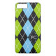Argyle pattern black, green, blue monogram personalised feminine custom iPhone 7 plus case. Diamond shapes in black, lime green and sky blue, white intercrossing diagonal lines and a diamond with your initials.
